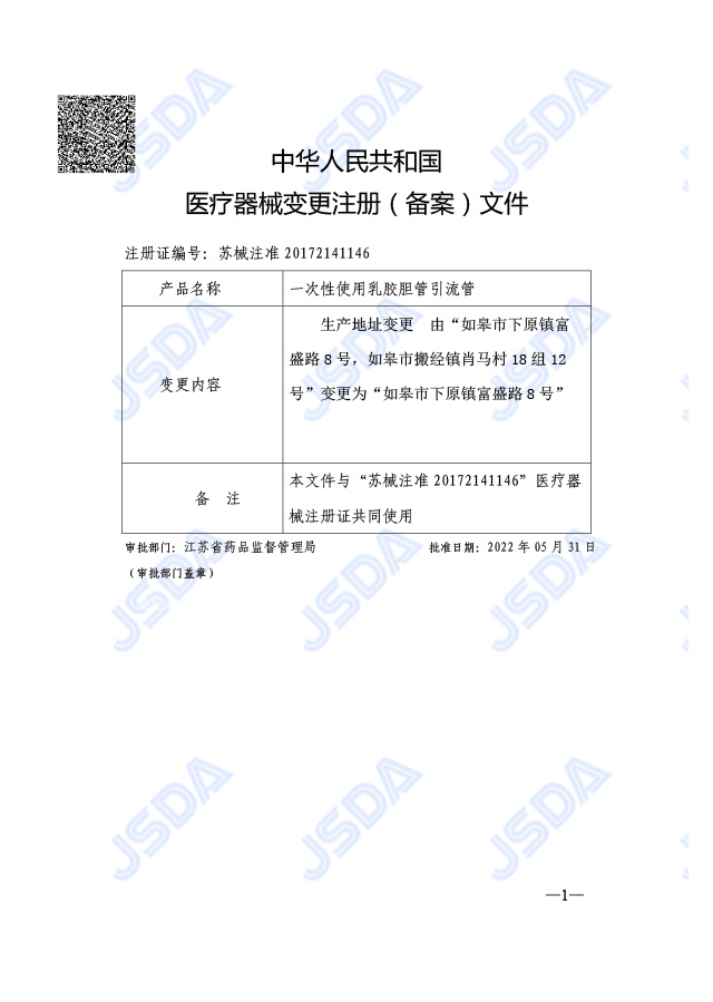 一次性使用乳胶胆管引流管注册证变更