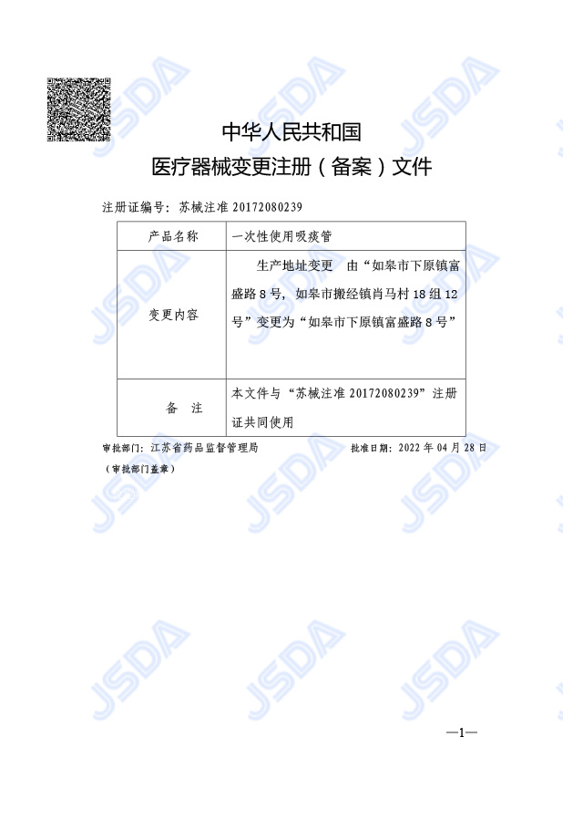 一次性使用吸痰管注册证变更